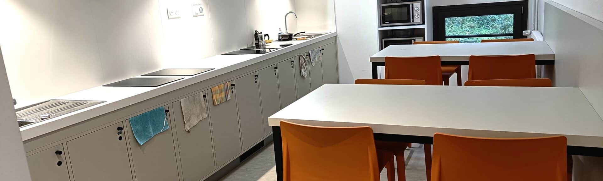 Chaque cuisine est équipée de plaques de cuissons, micro-ondes, éviers, hottes, plans de travail pour préparer les repas.